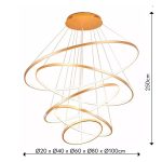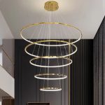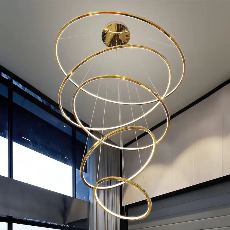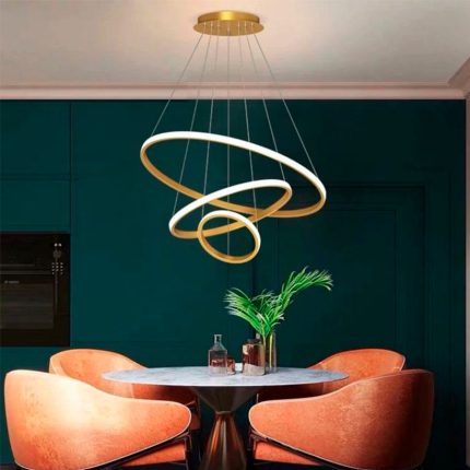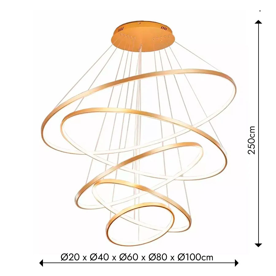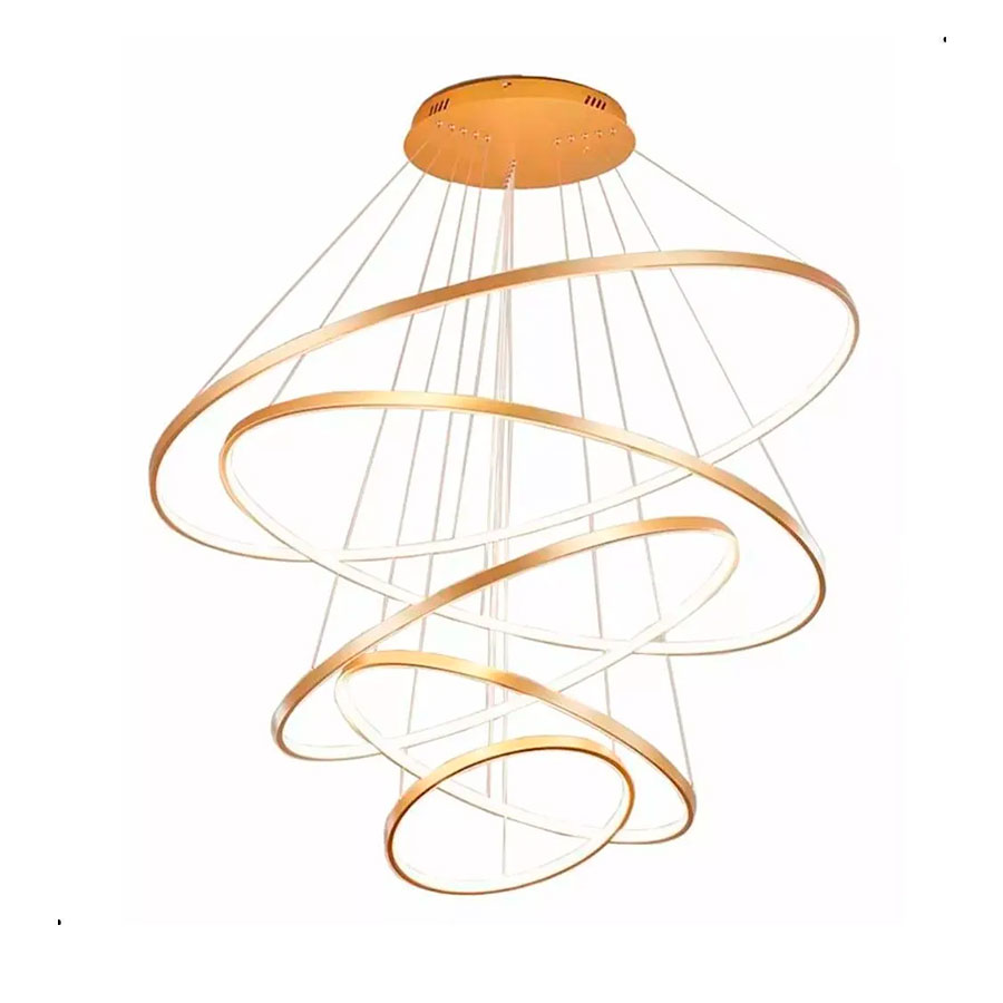 Para los amantes de lo moderno y minimalista, nuestra lámpara colgante 5 anillos Gold, es una opción sofisticada y versátil para iluminar tus espacios interiores con estilo y eficiencia. Su tecnología LED integrado te brinda un ahorro de energía significativo y una vida útil prolongada. Fabricada con materiales de alta calidad, como aluminio y policarbonato. Posee cables suspensores que permiten adecuar según estilo la ubicación de los aros. Ideal para iluminar salones, hoteles en espacios de doble altura.